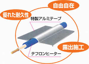 ヒーター素材は最強樹脂テフロンでできており、紫外線・荷重・酸・アルカリ・熱に圧倒的な強さを誇り、半永久的な耐久性を確立しました。だから露出施工ができる!!